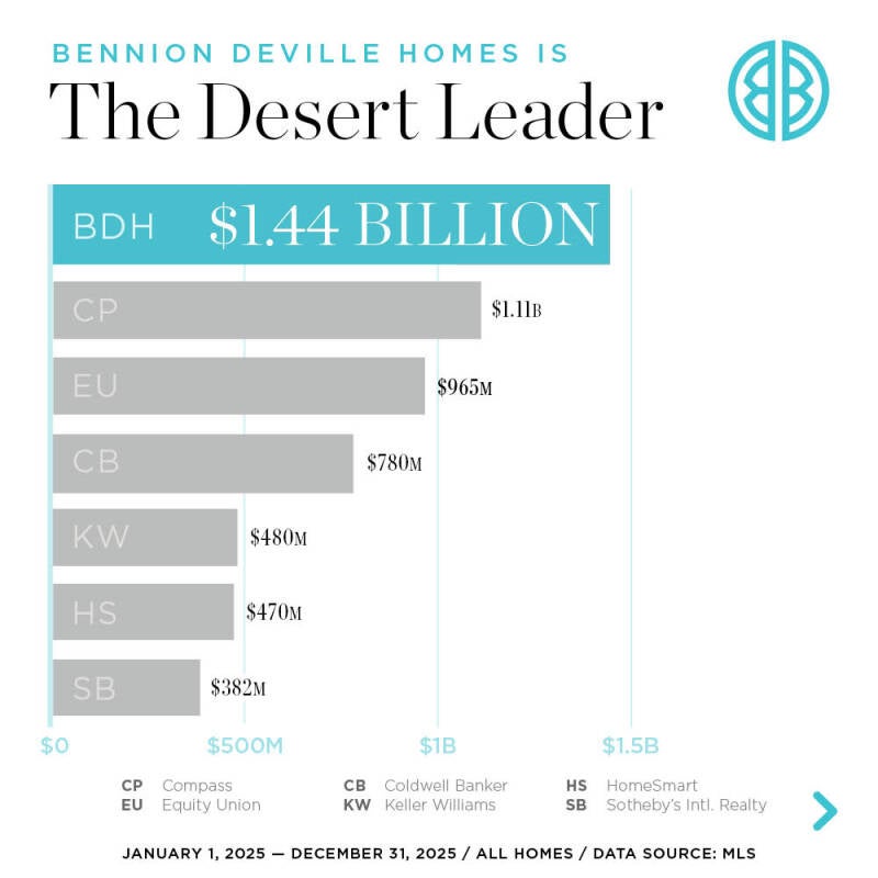 Seventeen years as the desert’s market leader doesn’t happen by accident. It’s the result of local knowledge, consistent performance, and a deep understanding of the communities we serve. I'm proud to be part of Bennion Deville Homes—and to put that leadership advantage to work for my clients every day. Remember, all real estate is local, and the best results start with a local Realtor®